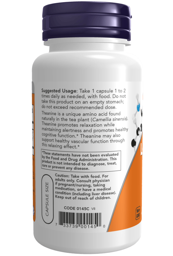 Descubre L‑Teanina 100 mg de NOW Foods en cápsulas vegetales. Promueve la relajación, calma mental y concentración natural. Apto para veganos y sin gluten.
