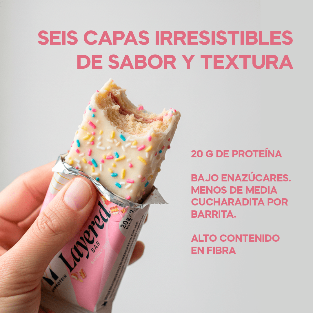 Layered Bar Vainilla Birthday Cake (Caja) – MyProtein: una experiencia deliciosa y nutritiva en cada bocado. Cada barra aporta aproximadamente 20 g de proteína de alta calidad, ayudando a favorecer la recuperación y el mantenimiento muscular, con una textura suave y varias capas de sabor a vainilla tipo torta de cumpleaños que la hacen irresistible. Con bajo contenido de azúcar y un aporte equilibrado de carbohidratos, es el snack perfecto para después del entrenamiento, entre comidas o cuando necesitas energía extra sin salirte de tu plan. La caja contiene 12 unidades, ideales para tener siempre a mano una opción rica, práctica y proteica.