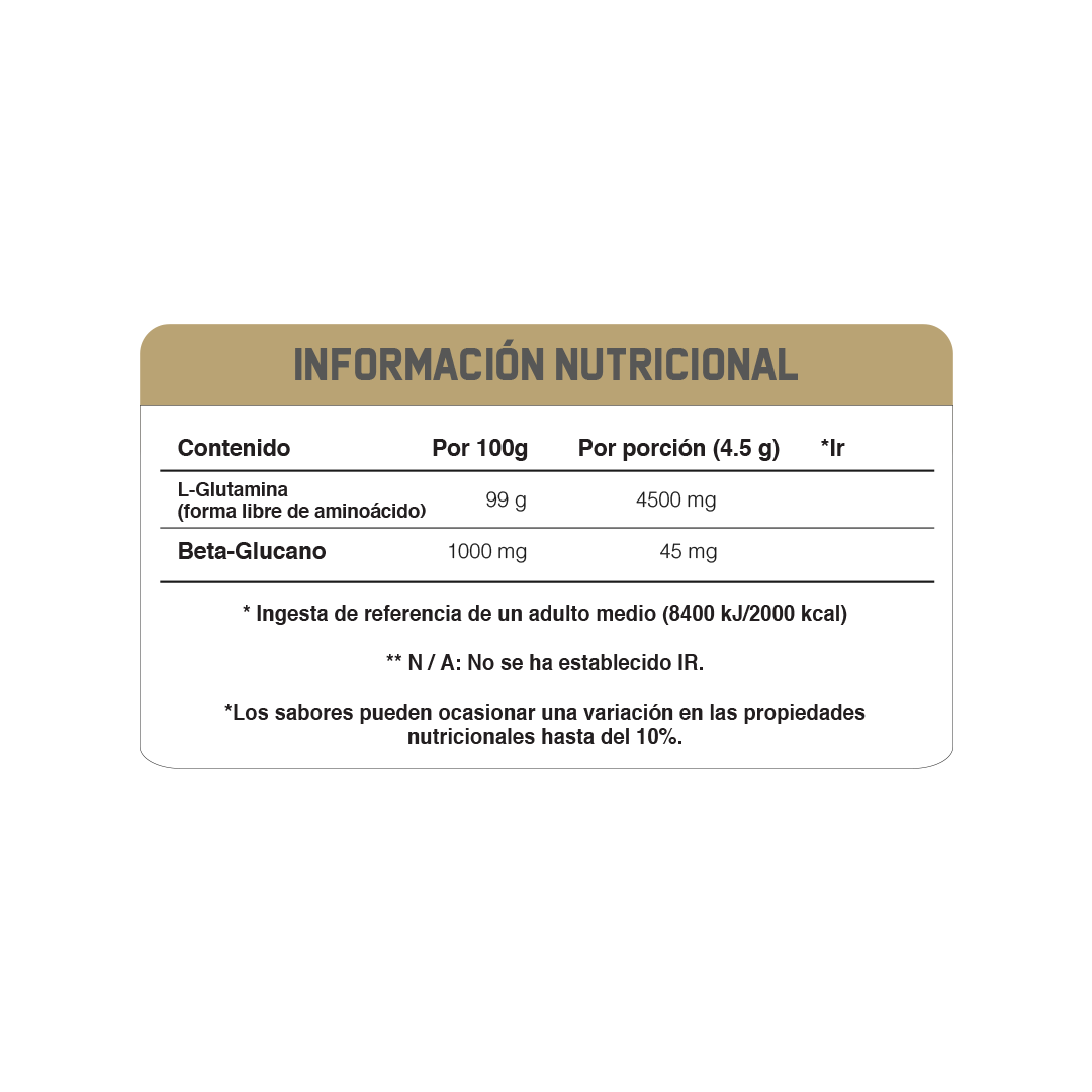 The Glutamine es el suplemento ideal para acelerar la recuperación muscular y mantener un sistema inmunológico fuerte después de entrenamientos intensos. Cada porción contiene 4500 mg de L-glutamina pura, un aminoácido esencial para reparar tejidos musculares, reducir el dolor post-entrenamiento y optimizar el rendimiento físico. Además, aporta 45 mg de beta-glucano, una fibra soluble que estimula las defensas naturales del organismo, favoreciendo una recuperación integral y reduciendo el riesgo de enfermedades relacionadas con el esfuerzo físico.