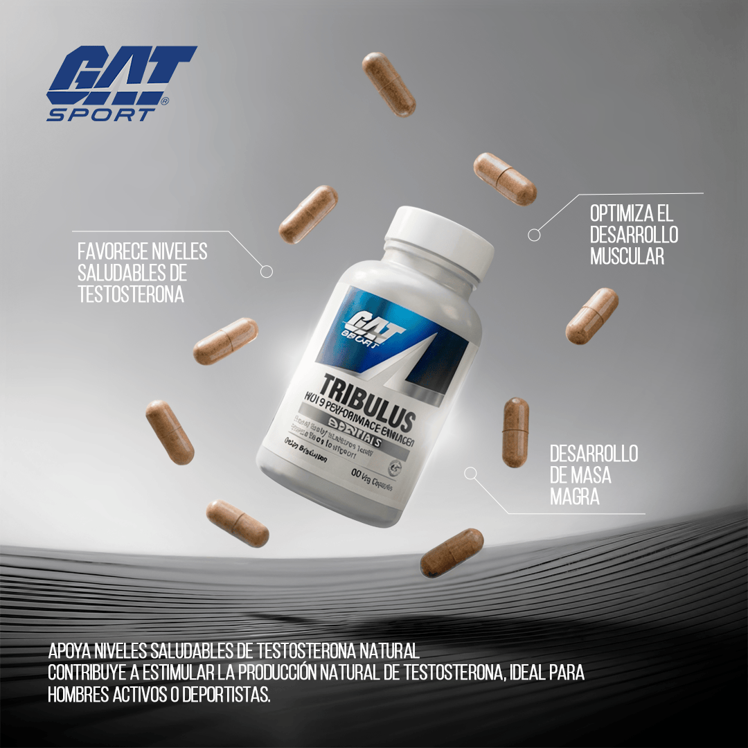 Tribulus Essentials GAT Sports aumenta la testosterona natural, la energía y la fuerza muscular. Suplemento vegetal ideal para mejorar el rendimiento y vitalidad masculina.